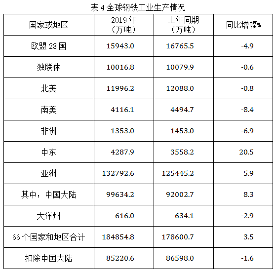 据世界钢协统计数据,2019年全球(66个国家和地区)粗钢产量达18.49亿吨,同比增长3.5%。除中东、亚洲、中国大陆和66个国家和地区合计增长外,全球其他国家(地区)粗钢产量不同程度的降低,中国大陆粗钢产量占全球的53.90%。主要地区粗钢产量见表4和图5。