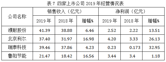 表7是耐火材料行业4家上市公司2019年与2018年经营情况的比较(数据来源,上市公司年报快报)。4家上市公司的销售收入增幅明显高于行业平均水平,净利润水平良好。虽然2019年行业的平均价格水平较2018年度明显降低,但四家上市公司的平均净利润率达到7.4%(2018年7.1%),表明耐火材料行业的优势企业发展良好,一定意义上也表明行业集中度正在稳步提升。