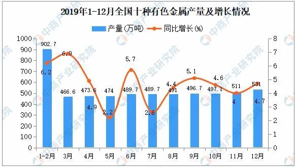 2019年,全国十种有色金属产量为5841.6万吨,同比增长3.5%。其中,精炼铜产量978.4万吨,同比增长10.2%;原铝产量3504.4万吨,同比下降0.9%;铅产量579.7万吨,同比增长14.9%;锌产量623.6万吨,同比增长9.2%。铜加工材产量2017.2万吨,同比增长12.6%。氧化铝产量7247.4万吨,同比下降1.0%;铝材产量5252.2万吨,同比增长7.5%。