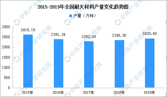 根据协会统计,2019年全国耐火材料产量2430.75万吨,同比增长3.65%。其中,致密定形耐火制品1341.36万吨,同比增长1.05%;特种耐火制品增长3.44%。保温隔热耐火制品58.90万吨,同比增长8.87%;不定形耐火制品1030.49万吨,同比增长6.93%。